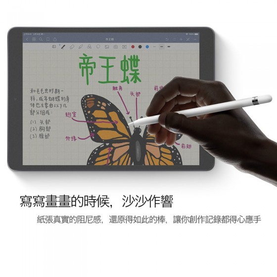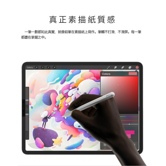 一張能讓使用者進入最佳創作環境的神奇貼膜 提供更符合人體工學的手感,就像紙張與鉛筆的摩擦感 不管手寫或畫圖都如同在紙上創作,不會過滑 且不管是手上油漬或手汗都不用擔心。